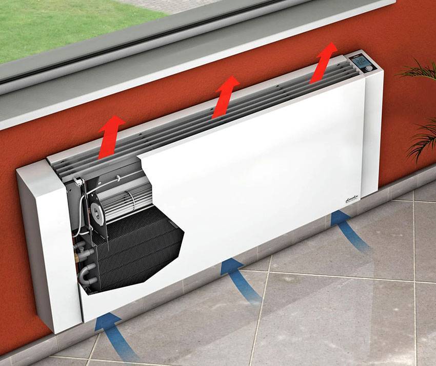 Естественная конвекция происходит достаточно медленно, поэтому для более быстрого прогрева помещения может быть использована принудительная, создаваемая путём использования вентилятора. Разные модели конвекторных обогревателей различаются по габаритным размерам и способам установки, техническим характеристикам и видам используемой первичной энергии: электричество, газ и теплоноситель системы отопления. Принцип работы обогревателей данного типа приведён на следующем рисунке.