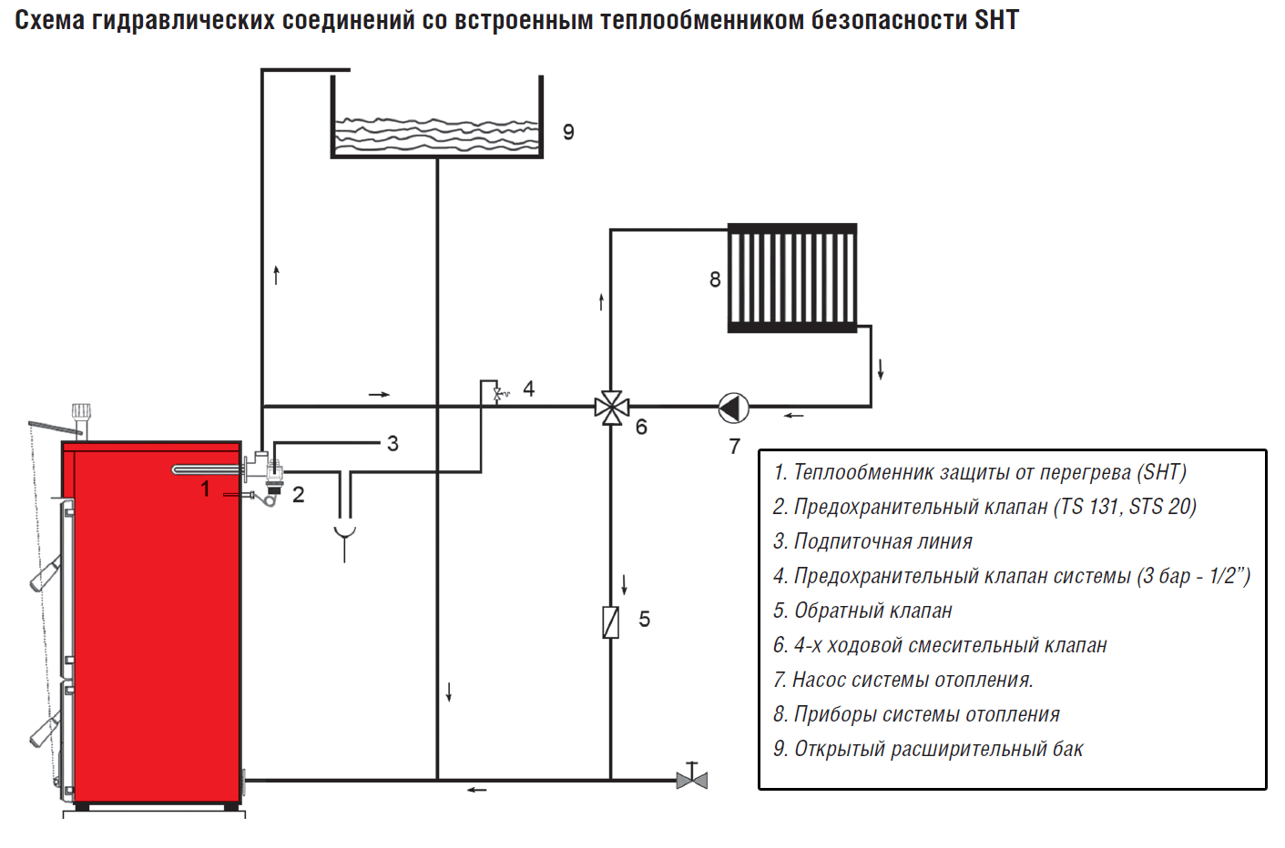 Особое внимание следует уделить стыковочным стальным или чугунным трубам. Они необходимы для понижения температуры воды, поступающей от котла, до приемлемой (не выше 95°С)
