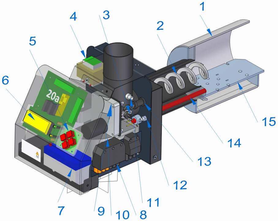 Функциями пеллетного горелочного устройства – является создание условий в топочном пространстве для равномерного и полного сжигания пеллет, создание нужного процентного содержания топливно-воздушной смеси и стабильного режима горения пламени, для выработки и передаче тепловой энергии к водяному теплоносителю, циркулирующему по внутреннему сечению котловых поверхностей нагрева.