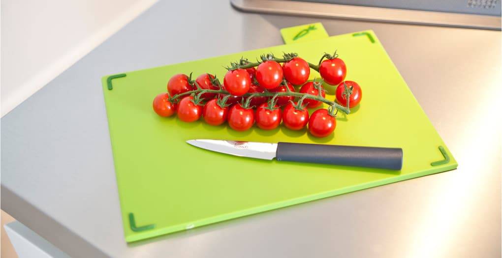 При приготовлении пищи не обойтись без разделочной доски. Наверное, нет такой хозяйки, которая не использует разделочные доски. На кухнях общественных точек питания их обычно не меньше 20. Для каждой группы продуктов – своя. Такое же правило должна соблюдать хорошая хозяйка. Разумеется, 20 досок – это перебор, но как минимум 3 должны быть на каждой кухне. Первая — для мяса и рыбы, вторая – для хлеба, третья – для фруктов, овощей и готовых продуктов. Если есть возможность, заведите отдельную маленькую доску для резки лука и чеснока. Тогда микробы и бактерии с мяса и рыбы не попадут на готовые продукты, а запахи продуктов не будут смешиваться.