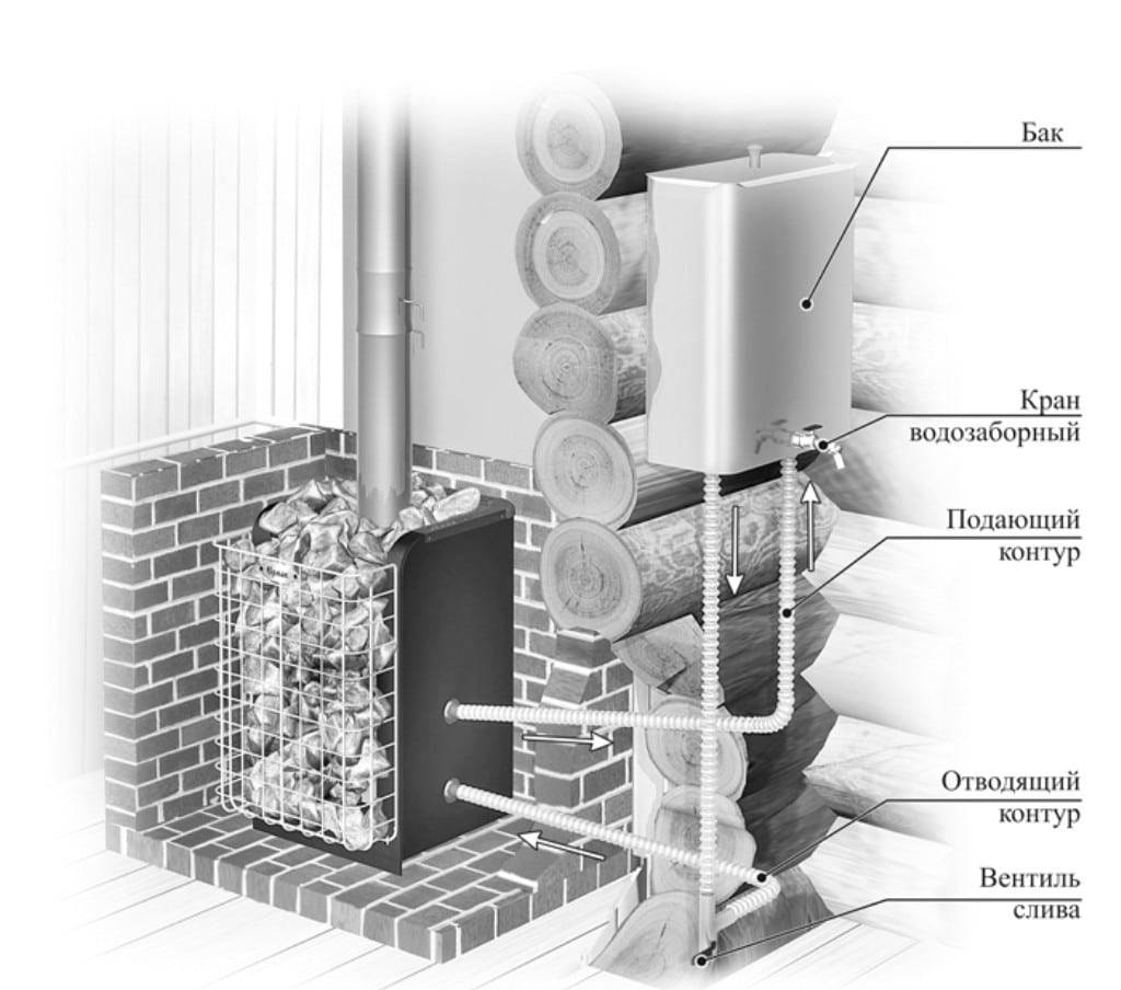 Если в качестве источника тепла предполагается использовать дровяную печь, то следует сразу же просчитать и спроектировать специальный теплообменник. Он выглядит как змеевик, сваренный из металлических труб. Этот элемент встраивается прямо в конструкцию печи, а не устанавливается отдельно.