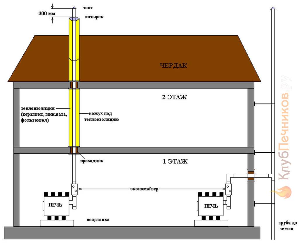 Только лишь такая конструкция дымохода позволит эксплуатировать булерьян длительного горения без проблем с тягой, без задымления и обратной тяги.