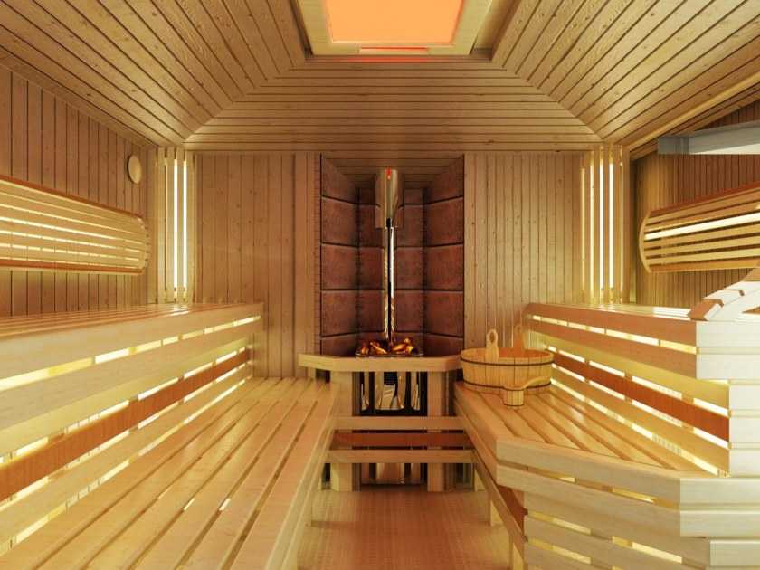 В парной важнейшими конструкционными элементами являются печь и полки. Полки для сидения должны иметь около 60 сантиметров длины, а полноценные для лежания – 1,9 метра. Выбирать можно между различными видами полок: скамья, плоская полка, либо с дополнительным подпором для головы.