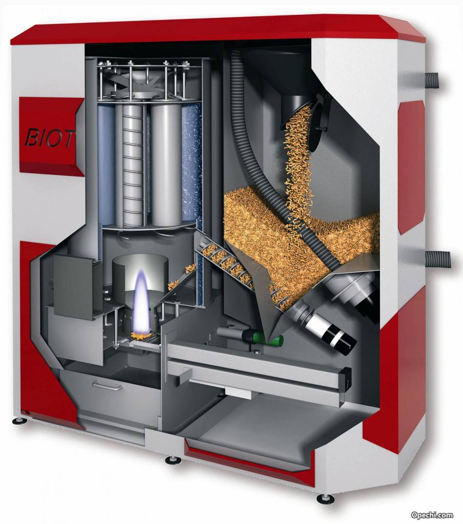 - автоматические (полный набор самостоятельных функций загрузки, розжига, очистки, встраивается в систему управления температурой) – подходит для больших объектов, где требуется непрерывное отопление. Автоматика позволяет программировать режимы отопления;