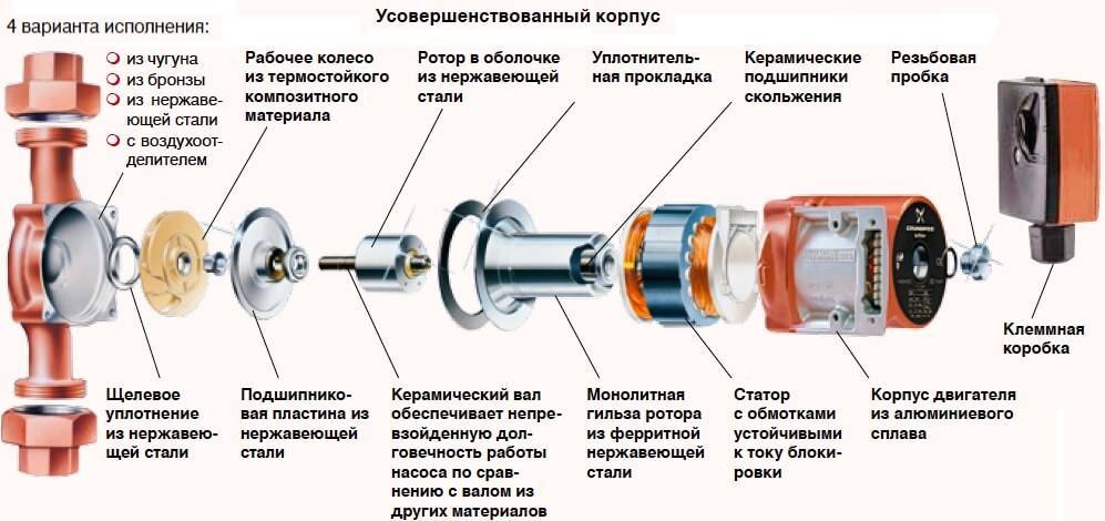 Данный прибор постоянно контактирует с водой. В целях защиты от коррозии, корпус изготавливают из нержавеющей стали, алюминия, бронзы или латуни. Для отопления насос циркуляционный Grundfos (аналог названия – Грандфос или Грюндфос) выпускается единым устройством. Есть узел управления и электродвигатель.