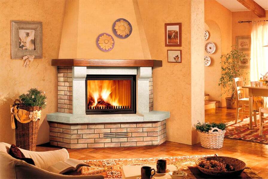 Для крупного камина потребуется свободная стена с пространством перед камином, либо свободный угол. Традиционно камины строят в центре стены. Но интерьер и чувство вкуса могут подсказать, иное расположение. Угловой камин может быть строгим треугольником, или иметь форму призмы.