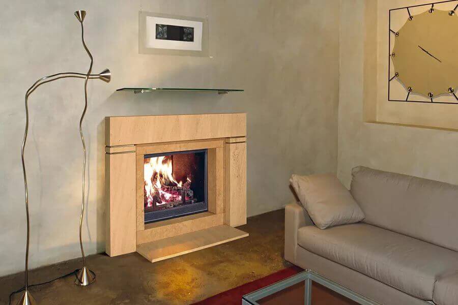 Верхняя полка делается из массива дерева, низ камина – из камня