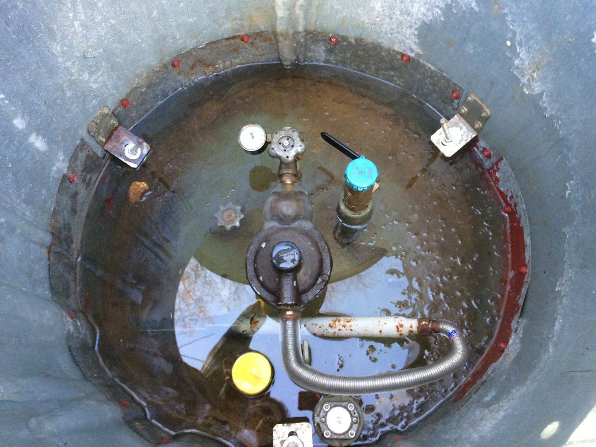 Если грунтовые или паводковые воды затопят ревизионный колодец, добраться до заправочного клапана или аварийного крана получится только после откачки. Если вода замерзнет, придется сначала растопить лед. В обоих случаях необходимо снять и просушить редуктор.