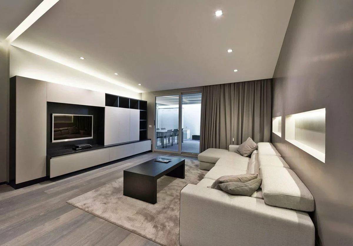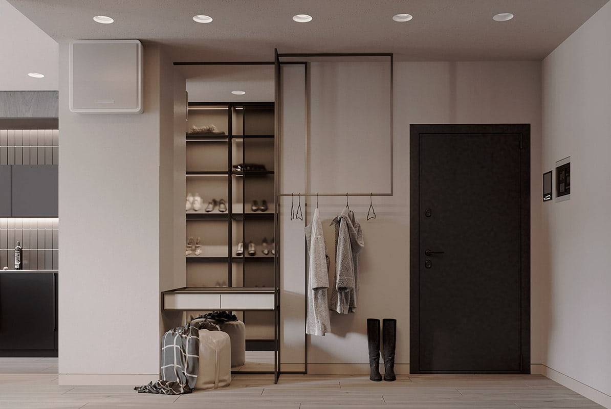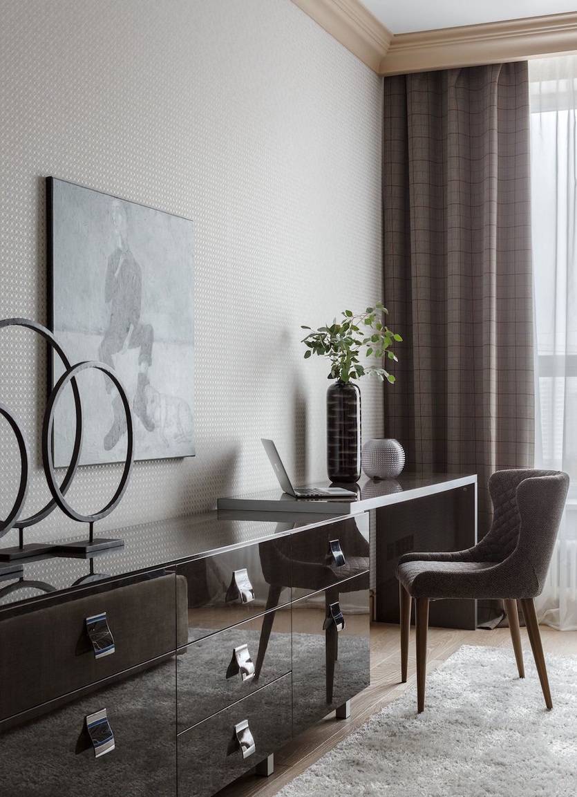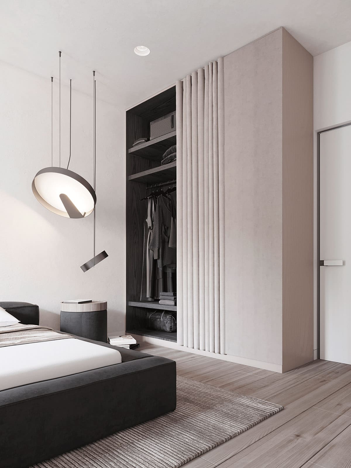 Минималистическая монохромная и не контрастная отделка стен, пола, потолка дает неограниченную свободу выбора и размещения модульной мебели, встроенных шкафов, трансформеров.