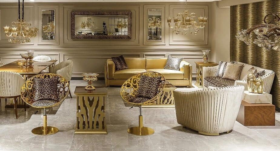 - Золото в виде декора. Предметы из золота или с позолоченным покрытием будут практически универсальным украшением для любого интерьера. Особенно необычно они смотрятся в ярких однотонных обстановках. «Драгоценным» может быть практически любой элемент декора: рама картины, напольные горшки для цветов, кресло и даже такие мелкие детали как ручки и ножки шкафов и комодов.