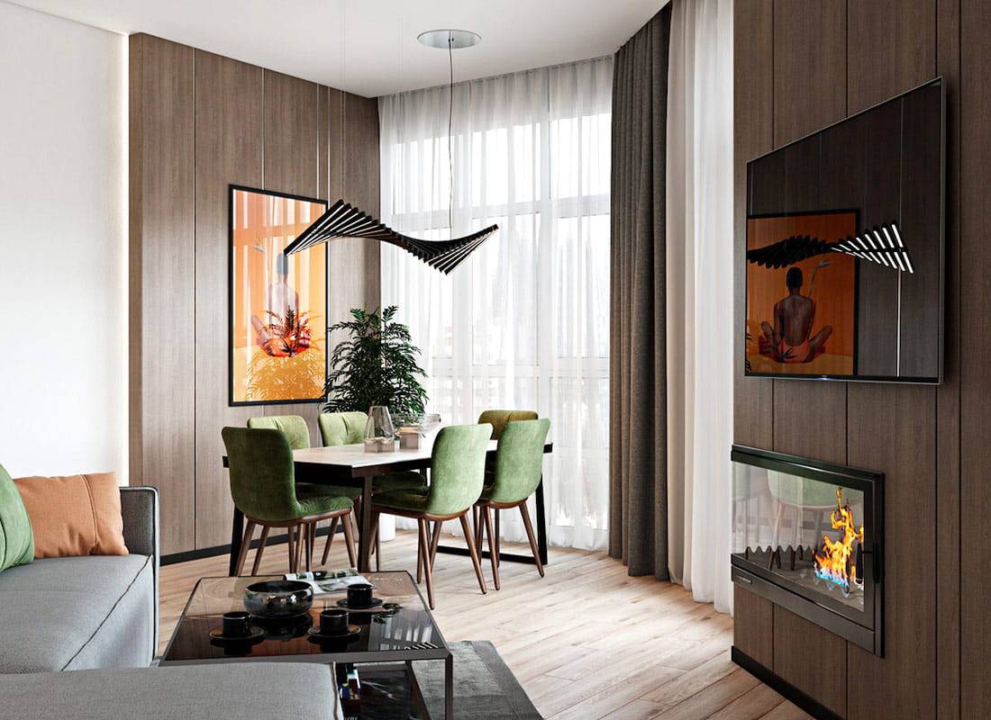 Интерьер зала 2020 требует продуманного подхода. Идеально, если это просторное помещение. Тогда можно будет использовать яркие краски, например, цвета из палитры зеленого цвета.
