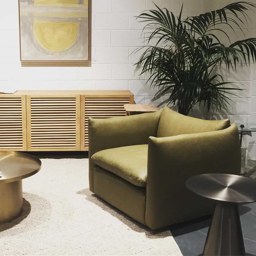 На последних дизайнерских выставках чаще всего можно увидеть мебель, имеющую элегантные обтекаемые формы. В гостиной в стиле модерн обязательно присутствует удобный диван и кресло насыщенных роскошных цветов (например, из бордового или зелёного велюра) и небольшой столик.