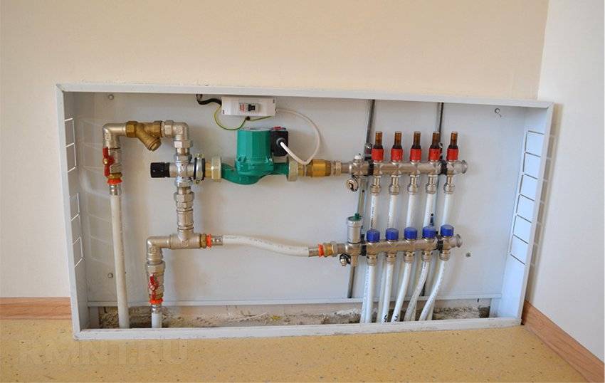 Коллекторы для теплого пола могут снабжаться дополнительным насосом рециркуляции и общим терморегулятором. Это очень характерно для многоэтажных домов, например, при комбинации теплого пола с радиаторами на разных этажах. Базовая температура теплоносителя составляет 60–70 градусов, что для теплого пола очень много. Поэтому насос подмешивает часть воды из обратки, снижая нагрев пола до 35–40 °С.