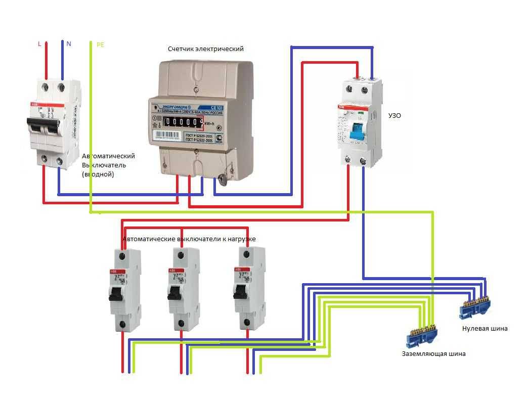 Это что касается подключения проводов к однофазному счетчику. Теперь о схеме подключения. Как уже говорилось, перед электросчетчиком ставится входной автомат. Его номинал равен максимальному току нагрузки, срабатывает при его превышении, исключая повреждение оборудования. После ставят УЗО, которое срабатывает при пробое изоляции или если кто-то прикоснулся к токоведущим проводам. Схема представлена на фото ниже.