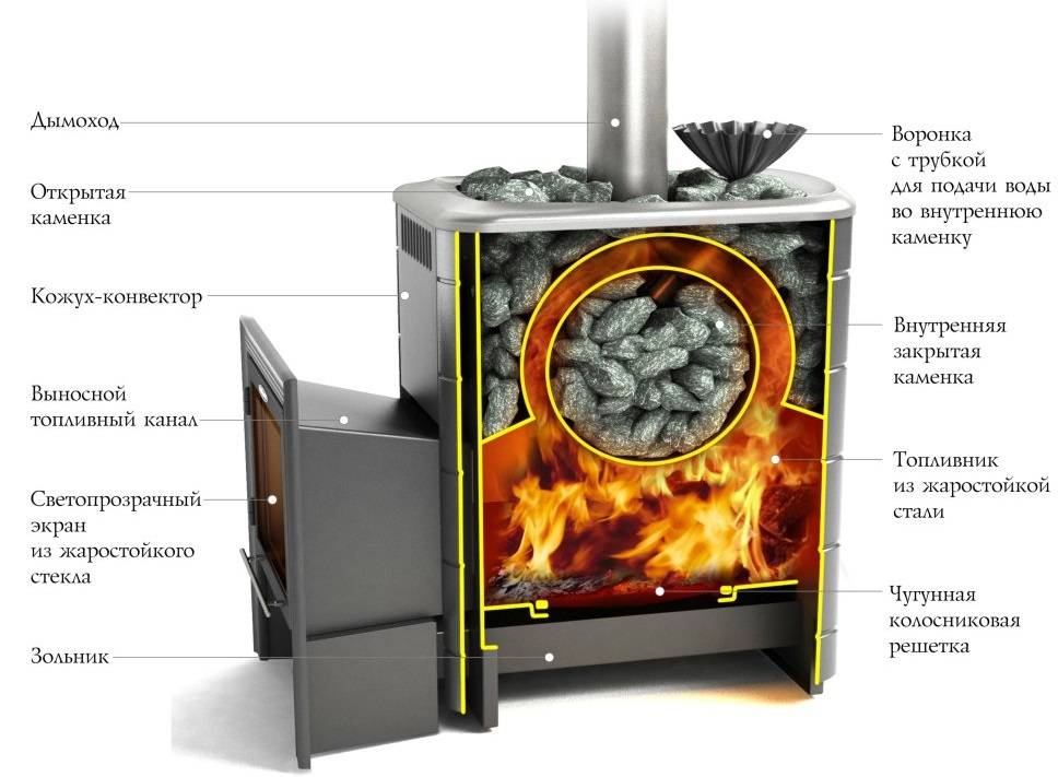 Конструктивный элемент печки, предназначенный для сгорания топлива. Многие любители парной убеждены, что лучшая дровяная печь для бани та, которая имеет дверку топки из огнеупорного стекла. Почему, мы уже говорили выше.