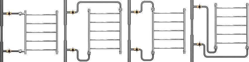 На схемах с подключением показаны способы подключения и заужение на стояке, но не показано, что для естественной циркуляции горячей воды, трубы к полотенцесушителю нужно прокладывать под уклоном, если так сделать не получается, то придется чаще спускать воздух из системы.