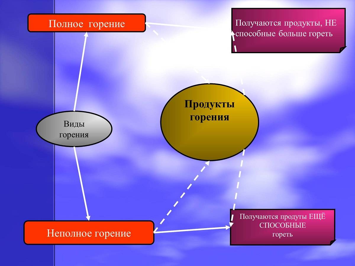 Горение по характеру может быть полным или неполным. Но оба они происходят с образованием дыма. При неполном горении некоторые продукты сгорания еще могут гореть в дальнейшем (сажа, окись углерода, углеводороды). А вот если произошло полное сгорание, то тогда продукты, которые образовались в дальнейшем, гореть не способны (сернистый и углекислый газы, пары воды).