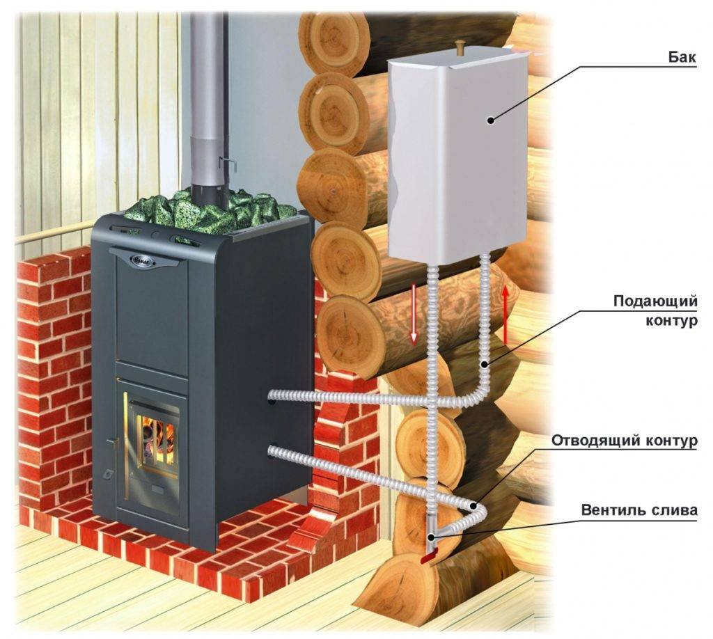 банная печь отдает часть энергии теплообменнику. Не рационально применять большие емкости, чтобы можно было нагреть больший объем воды. Подобный подход может значительно снизить комфортность пребывания в парилке, увеличить расход топлива и создать неблагоприятный микроклимат. Бак с водой не должен забирать на себя больше 10% всей вырабатываемой энергии;