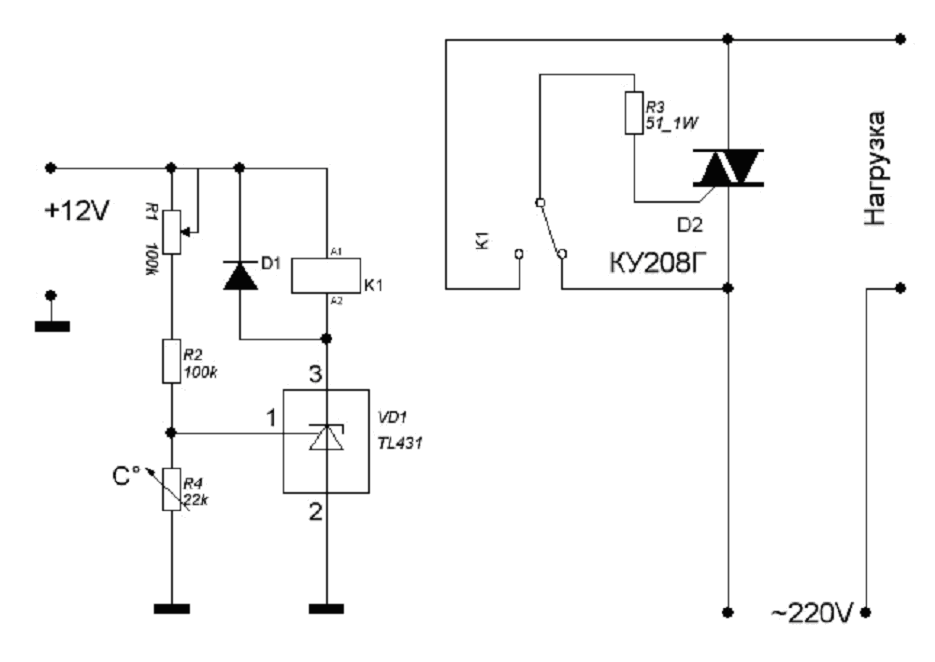 Типовой делитель подойдет для контроля напряжения. В одном плече устанавливают резистор, который реагирует на изменение температуры. Для управления исполнительным устройством подойдет реле.
