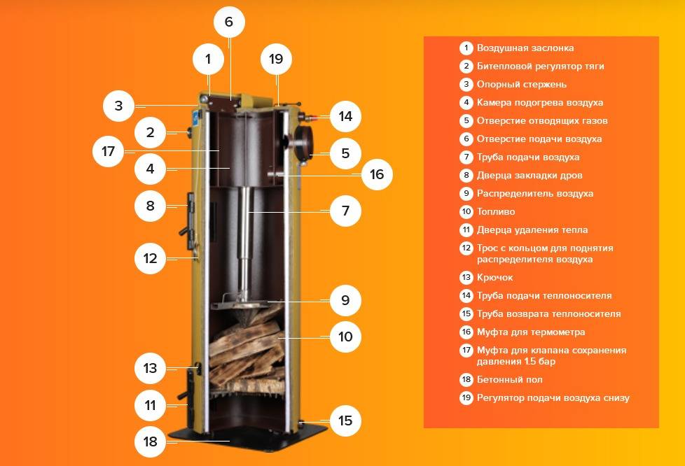 В устройстве реализован принцип горения сверху вниз. Он позволяет сгорать топливу медленнее, обеспечивая более эффективное использование тепловой энергии. Закладку поджигают сверху. Горит только поверхностный слой топливного материала. По мере его прогорания очаг постепенно опускается в нижние слои. Таким образом обеспечивается равномерность и длительность работы агрегата на одной порции топлива.