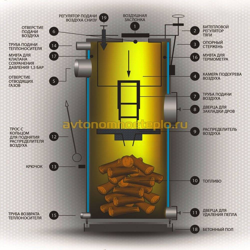 Продолжительность работы котла на одной загрузке, а значит и его производительность, зависит от исполнения определённых условий: