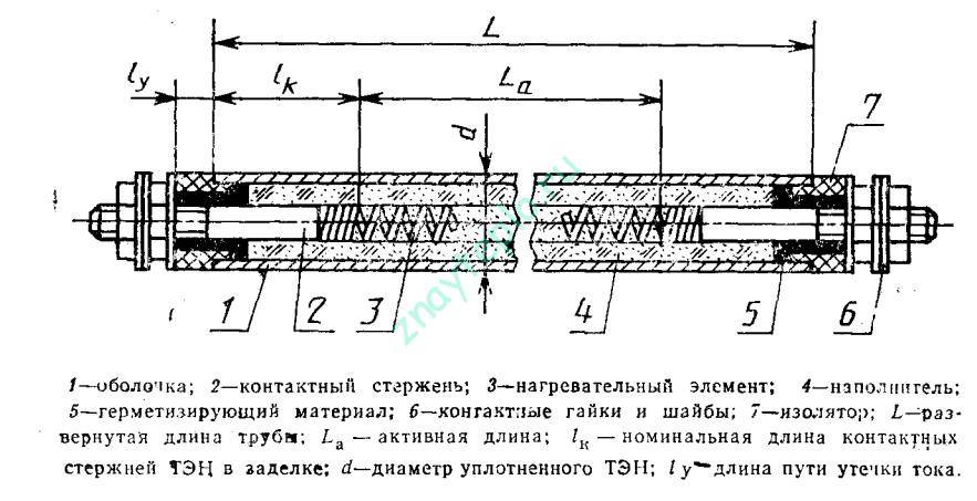 - Контактный стержень — металлический стержень с резьбой на конце, через который подключается питание ТЭНа.