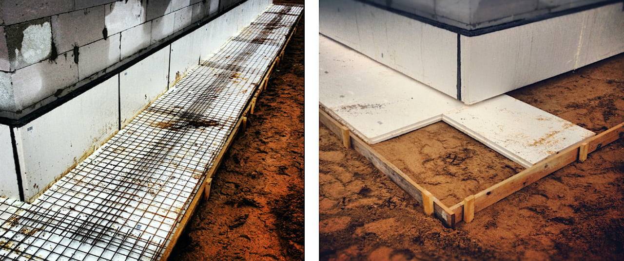 Пенопласт традиционно используется для теплоизоляции фундаментных оснований. Толщина определяется климатическими факторами, для условий северного климата достигает 15 см. Материал легко крепится к поверхности стен или несущему каркасу путем нанесения клея на пенопласт. Технология допускает возможность использовать специальные фиксаторы, при условии сохранения герметичности гидроизоляционного слоя.