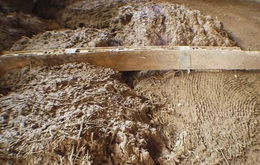 - Поверх теплоизоляционной пленки выкладывается трехсантиметровый слой глиняно-соломенной смеси. Данную конструкцию оставляют высыхать на месяц.