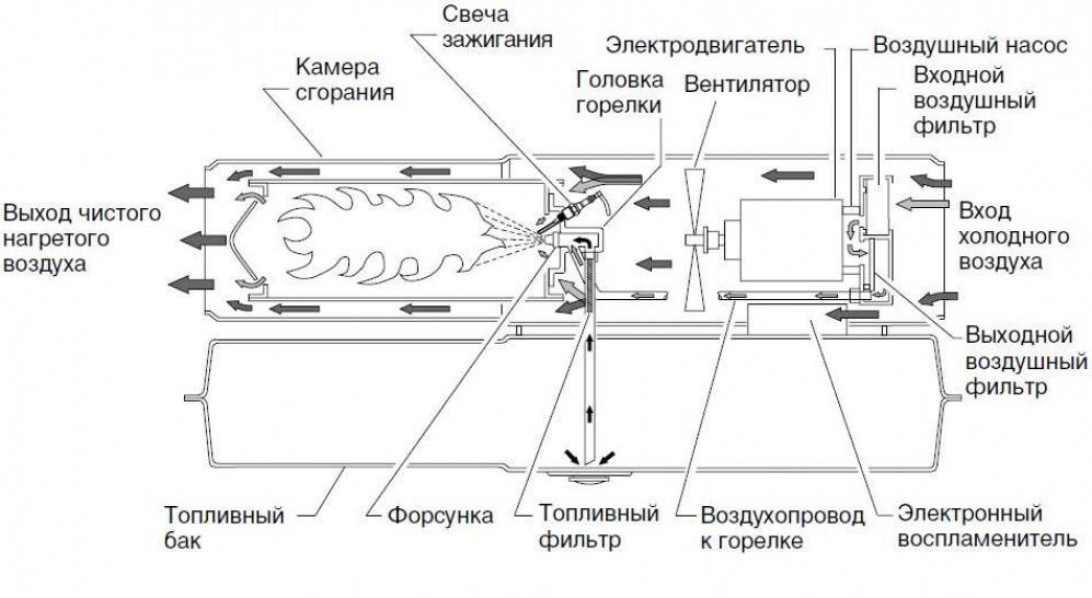 Принцип действия прибора заключается в том, что в конструкции использован специальный элемент нагрева — полый стакан или сопло, через который проходит нагреваемый воздух. В результате этого тепловая пушка может обогреть на 1 час от 500 м3, а обычное устройство за это время нагреет около 300 м3. Таким образом повышается скорость создания оптимальной температуры в помещении.