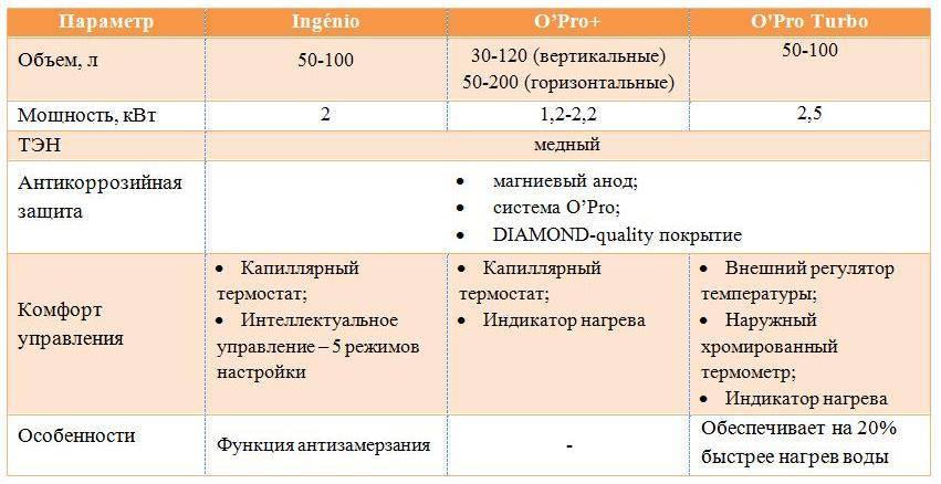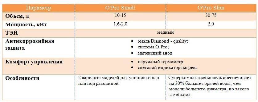 Модели бойлеров с линейки O’Pro + отличаются от других водонагревательных систем антикоррозийной защитой, что продлевает срок службы устройств. При желании, можно найти самые разные варианты бойлеров с объемом 30-200 литров.
