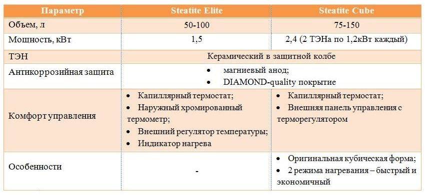 Бойлеры Steatite CUBE имеют привлекательный дизайн, и характеризуется кубическими формами. Нагревательный, керамический элемент в этих моделях размещается под углом, что дает возможность воде нагреваться намного быстрее, чем в обычных бойлерах. Устройства работают очень тихо, поэтому их можно устанавливать в квартире и пользоваться в любое время суток. В этой линейке есть множество моделей с объемом бака 75-150 литров.