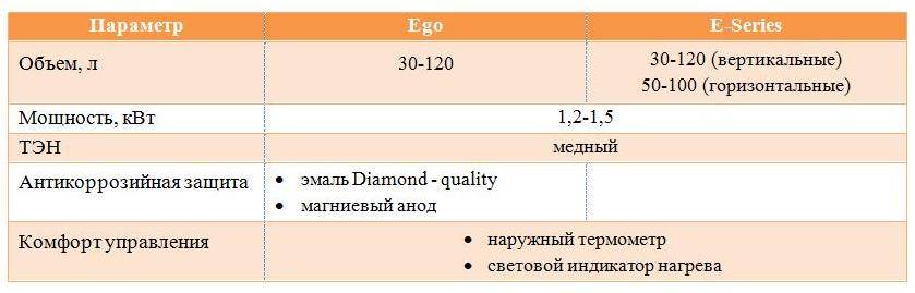 Ассортимент водонагревателей включает в себя три линии: Classic, Advanced и Premium. Первую составляют эффективные, простые и легкие приборы с нагревателем прямого погружения. Серия эконом-класса представлена двумя моделями – Ego и E-Series.
