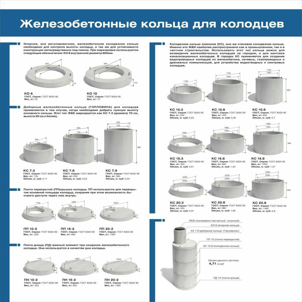 В современных строительных магазинах доступны бетонные конструкции с разными параметрами. Стандартные, максимальные размеры этого изделия выглядят следующим образом: высота — 100 см, внутренний диаметр составляет около 200 см. Удельный вес не более 300 кг. Максимальная толщина стенок — 120 мм.