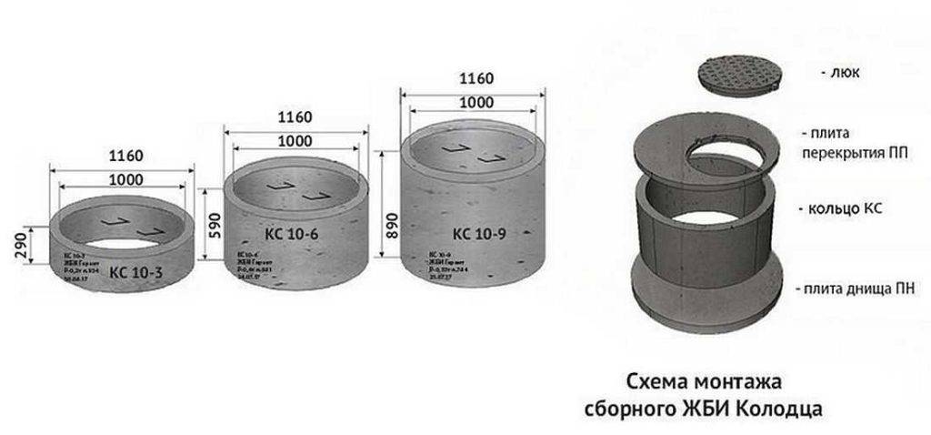 Для обустройства колодца используются бетонные элементы диаметром от 1000 до 1500 мм, при этом нижняя часть скважины плитой не закрывается (для сохранения доступа к водоносным слоям). Если планируется построить резервуар для хранения нечистот, то нижняя часть изготавливается из кольца с интегрированным бетонным дном. Допускается использование донной плиты, на которую устанавливается сквозной бетонный элемент. Остальные элементы (например, плиты перекрытия с отверстием под чугунный или пластмассовый люк) подбираются по диаметру стартового кольца.