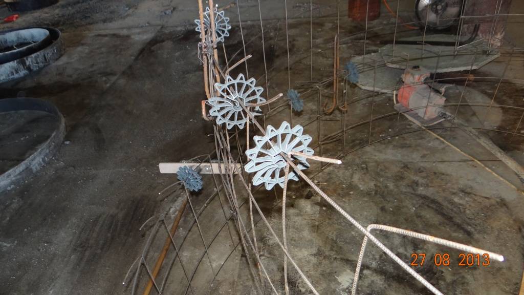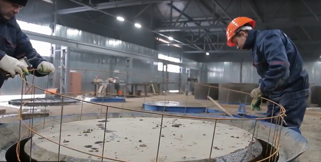 Для придания бетонным кольцам дополнительной прочности, на этапе формования, изделия армируются. Укладка арматуры производится перед заполнения формы вибропресса или виброформы бетонной смесью. Как правило, для армирования используется сетка Вр с ячейкой 200х200мм, диаметром 4мм. Перед укладкой в форму, арматурная сетка вяжется в кольцо. Высота арматурного кольца должна быть меньше высоты готового изделия. Арматуру может прижать бетонной смесью к стенке формы, что в дальнейшем неизбежно приведет ее к коррозии и разрушению. Чтобы этого не произошло, на проволоку одеваются специальные пластиковые центраторы, называемые фиксаторами арматуры “Звездочка”.